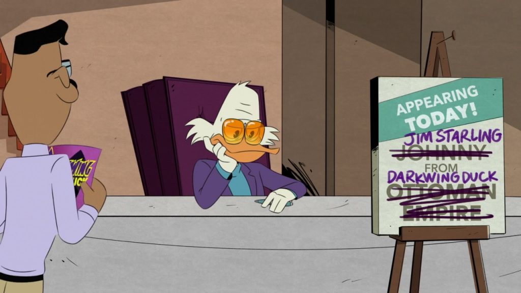 Jim Starling was the star of the hit 90’s television series “Darkwing Duck” which takes place in the DuckTales 2017 universe. Little is known about the show itself other than the fact Jim performed all the stunts himself and insisted the camera keep filming no matter what. It is never stated whether ‘Darkwing’ had an adopted daughter by the name of Gosalyn, and he definitely did not have a sidekick, due to Launchpad being a young fan of the show and not an actor.
