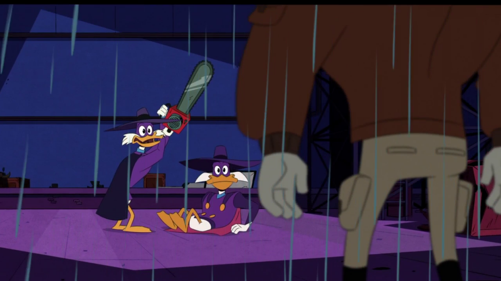 After sneaking back into the studio, Jim’s thirst for the spotlight outweighs the safety of others. He locks Drake Mallard in a closet in an attempt to steal the role, cementing his role as the antagonist. He steals Drake’s spot in the film but he accidentally destroys the movie set, endangering everyone until he is stopped by Drake Mallard (dressed as Darkwing Duck). Jim snaps and attempts to maim Drake with a chainsaw, but is stopped by Launchpad. He hesitates, only to be hit by stray electricity from a scene prop, causing an explosion. When the dust settles, Jim is nowhere to be found.