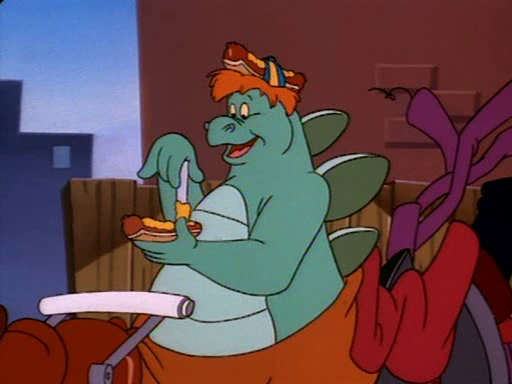 vlcsnap-2015-04-19-05h37m13s178Once an average janitor working at the St. Canard Natural History Museum, Stegmutt became the guinea pig for the maniac scientist Dr. Fossil and his Retro-Evolution Gun. Dr. Fossil had plans to turn all living beings into living dinosaurs, but was thwarted by Darkwing (with some assistance from Stegmutt).