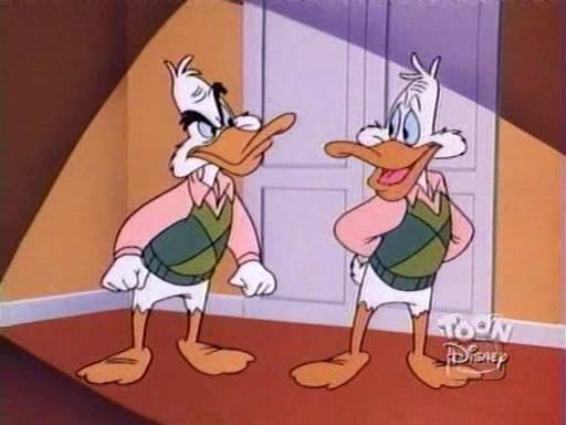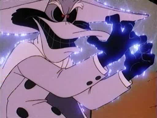 Tron-split Negaduck (not his official name) is the first incarnation of Negaduck, appearing in the episode “Negaduck”. He is created when Megavolt accidentally fires his tronsplitter at Darkwing, separating him into two beings: one version made entirely of “Positrons” (the element of good) and the other made entirely of “Negatrons” (the element of evil). They are completely identical, except Nega-DW is given bushier eyebrows to differentiate the two.